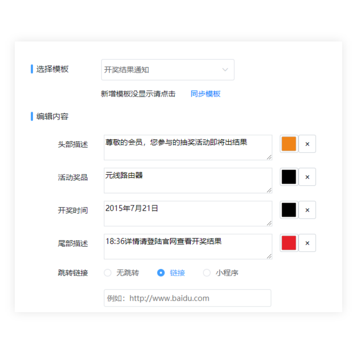 可以插入外部链接如:网页、小程序、图文消息、表单等形式,做到一步跳转;同时颜色和文案支持任意设置 支持链接跳转实时转化 支持颜色文案修改